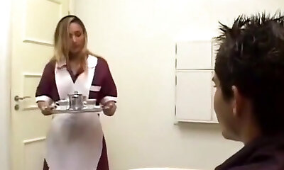 Gorgeous Cougar with hefty tits in the role of a maid dutifully sates her boss's big dick.