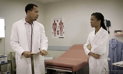Sexy doctor Kira Noir tempts her tall fucking partner to be fucked in the hospital