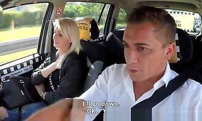Long legged British blonde in fake taxi gives oral pleasure